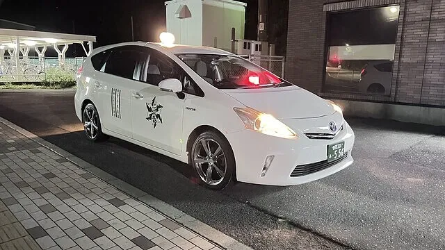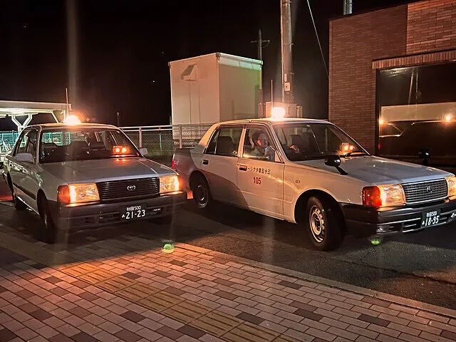 船越駅前、夜の静かな街角に、ひときわ目を引くタクシーが停まっています。